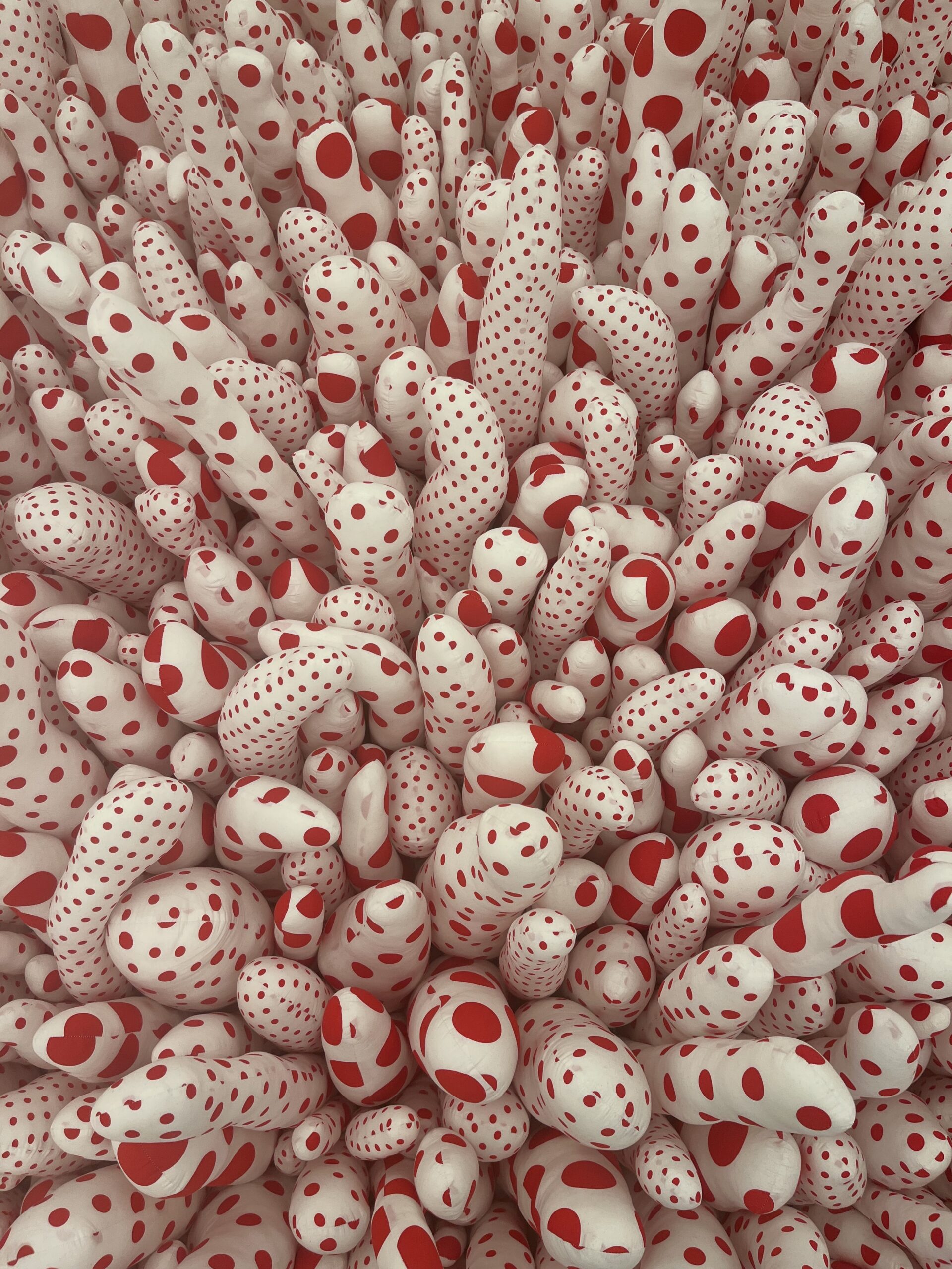 Kusama is best known for her use of repetitive patterns and polka dots, as well as her use of phallic shapes and sexual themes. She is also known for her development of the soft sculpture, a type of sculpture made from soft materials such as fabric, foam and paper.