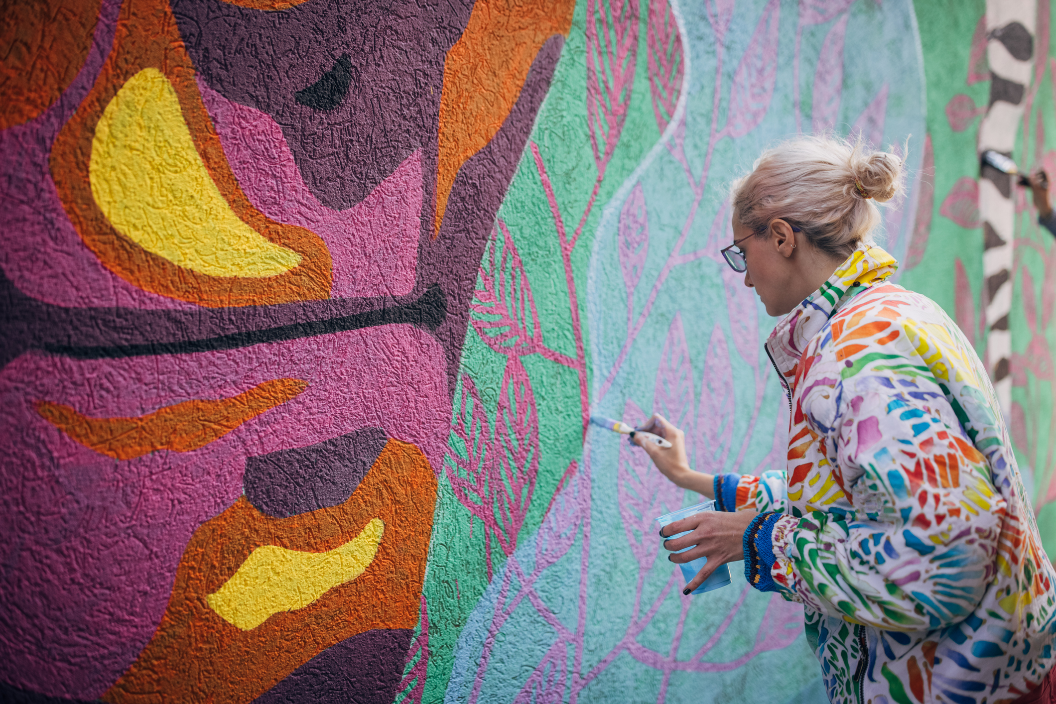 The mural art is painted in Hopare’s signature style that features bold, geometric lines and curves over colorful faces.